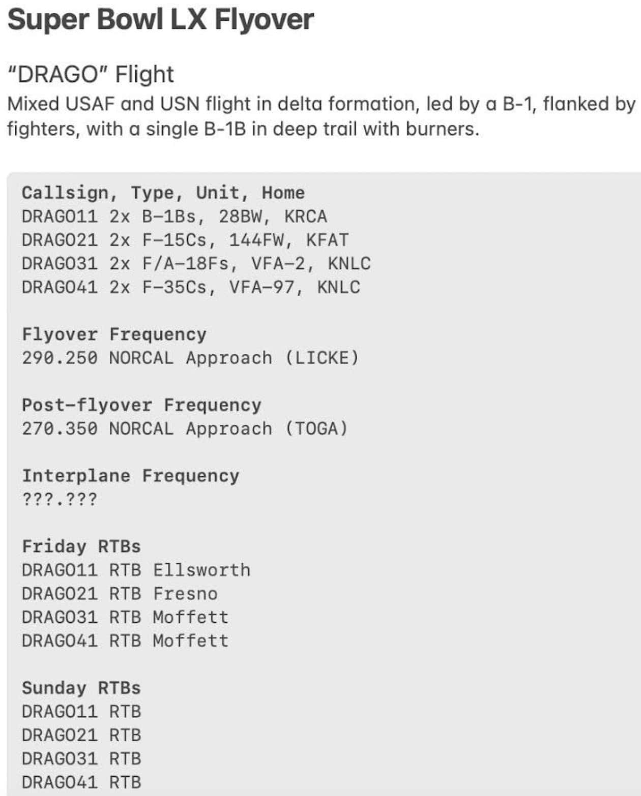 Super Bowl Flyover: 8 Aircraft will fly, call sign DRAGO