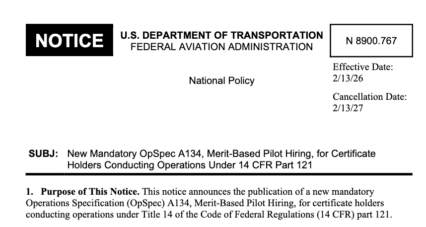 The new mandate, designated OpSpec A134, is titled “Merit-Based Pilot Hiring.” According to FAA Notice N 8900.767, published 13 February 2026, “The certificate holder shall ensure pilot hiring is exclusively merit-based to fulfill its duty to provide the highest possible degree of safety in the public interest.” The FAA is relying on its authority under 49 U.S.C. § 44701(b) and (d), federal law that allows the agency to establish safety standards for commercial carriers.