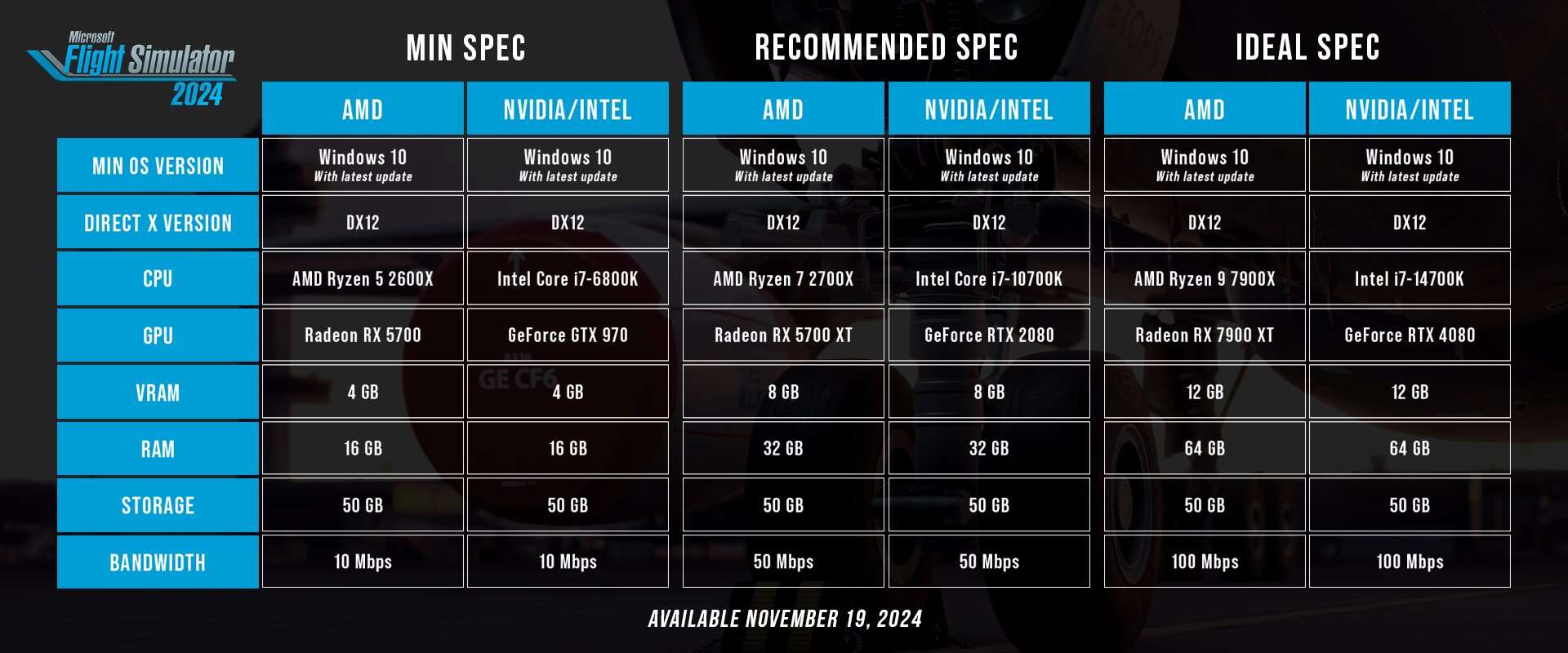 Minimum, recommended, and ideal system settings for Microsoft Flight Simulator 2024 | IMAGE: Microsoft