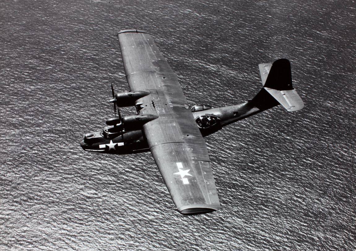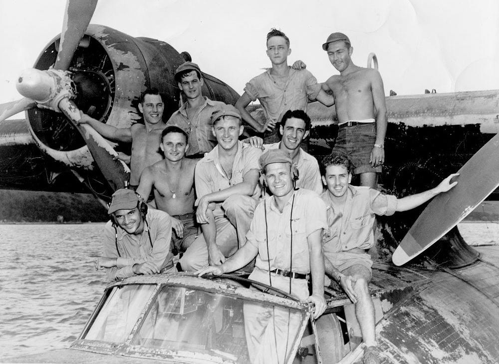 Gordon and crew were alerted that still another strafer had ditched in the water. This was B-25D Mitchell SN 41-30521 assigned to the 500th BS of the 345th BG and piloted by CAPT William J. Cavoli. Cavoli, who was the Operations Officer for the 500th BS, had ditched only about 600 yards from shore- close enough that the now unescorted Gordon was forced to overfly Kavieng itself while on approach to his next (and last) power-stall landing- a risky proposition indeed. Once again the PBY-5 fairly dropped out of the sky between the huge swells and immediately began taking on water. But after shutting down that port engine and taxying over to Cavoli and his crew, Arkansas Traveler was able to pull all six survivors aboard the Black Cat through the waist blister. Once again those heavy swells helped hide the flying boat in the troughs from the Japanese gunners on the island, who were well within range and threw everything they had at Gardenia Six. Gordon coaxed the now severely overloaded PBY-5 into the air and headed toward friendly territory. Score: 15 survivors plus Gordon’s own crew of nine = 24 aboard the aircraft. Bucket brigade finally catches up.