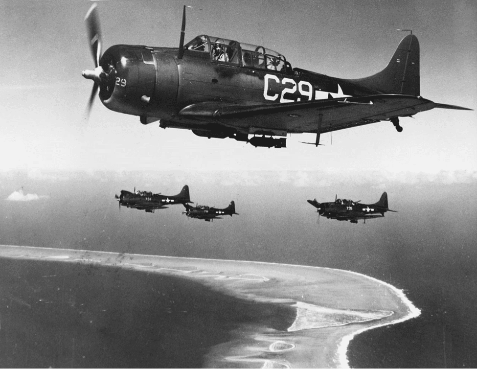 Navy carrier-based TBD Devastator torpedo bombers were savaged by the Japanese fighters defending the task force. But this drew the Japanese fighters down to low altitude, opening the door for the SBDs to set up and carry out their dive bombing attacks from high altitude with minimal resistance. Essentially they sank three Japanese carriers during a single seven minute attack and another a day later. The vaunted Japanese carrier aviation never recovered.
