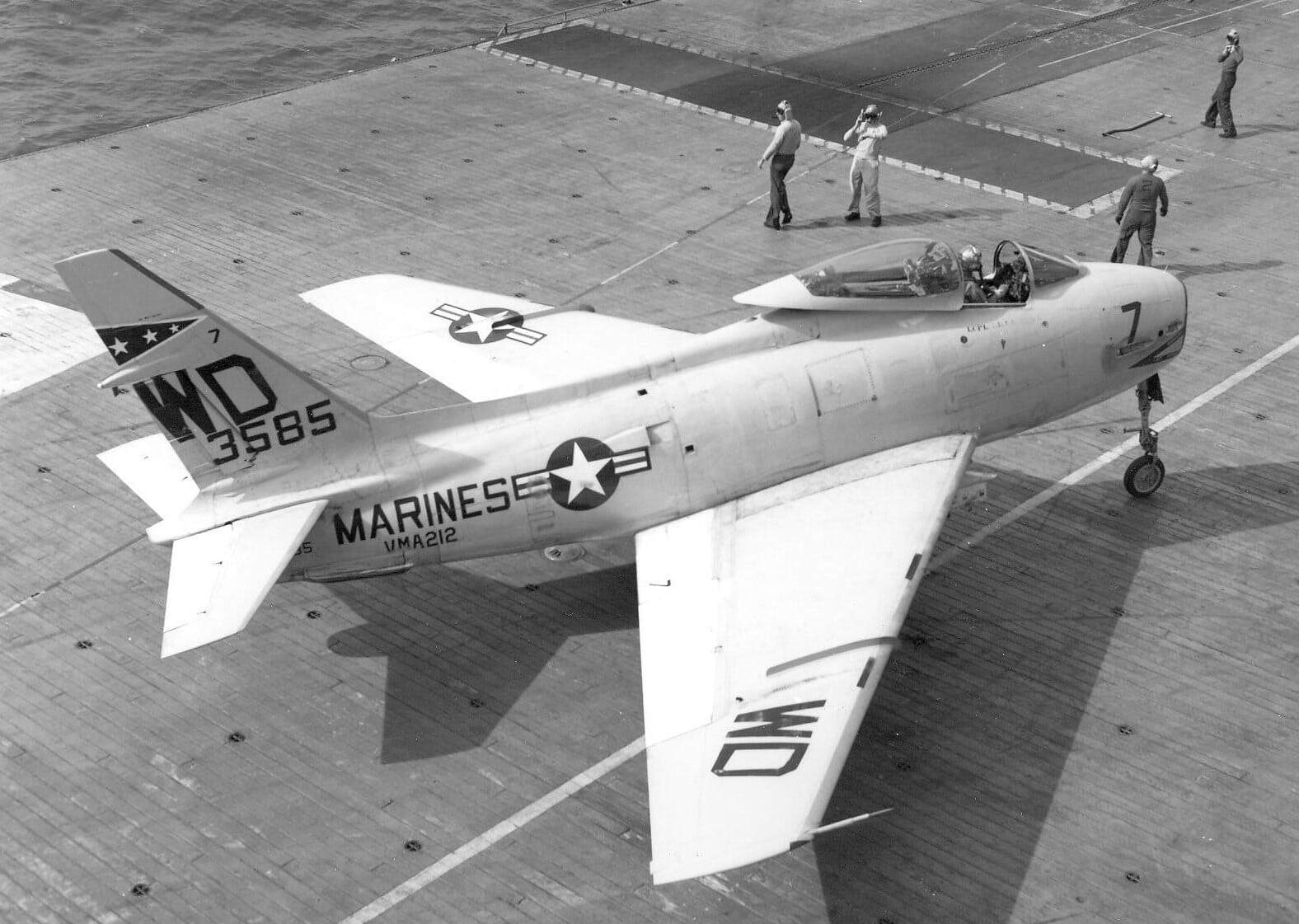 On 4 January 1956, an FJ-3 Fury flown by CDR Ralph L. Werner of VF-21 became the first aircraft to land aboard the new super carrier USS Forrestal (CVA-59).