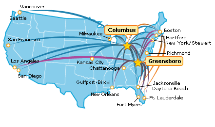 April 2007: Skybus announced its initial eight routes, all originating from the hub at Port Columbus International (CMH).