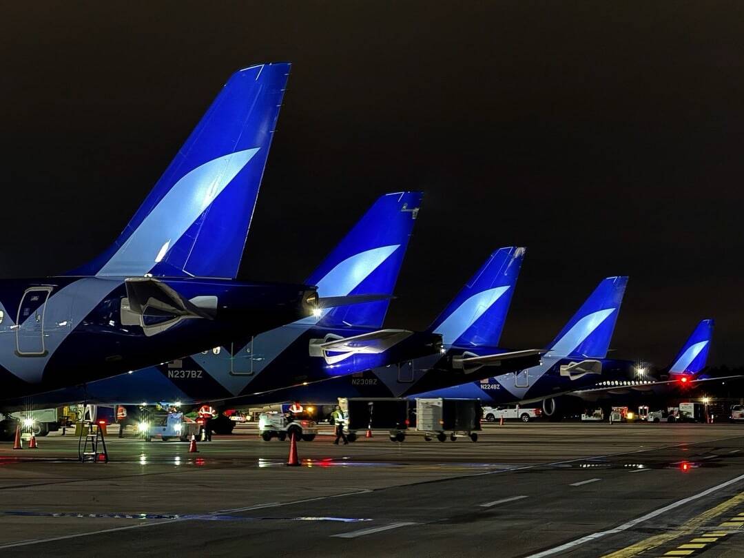 A nighttime shot of Breeze Airways Airbus A220-300s at the gate | IMAGE: Breeze Airways via Facebook