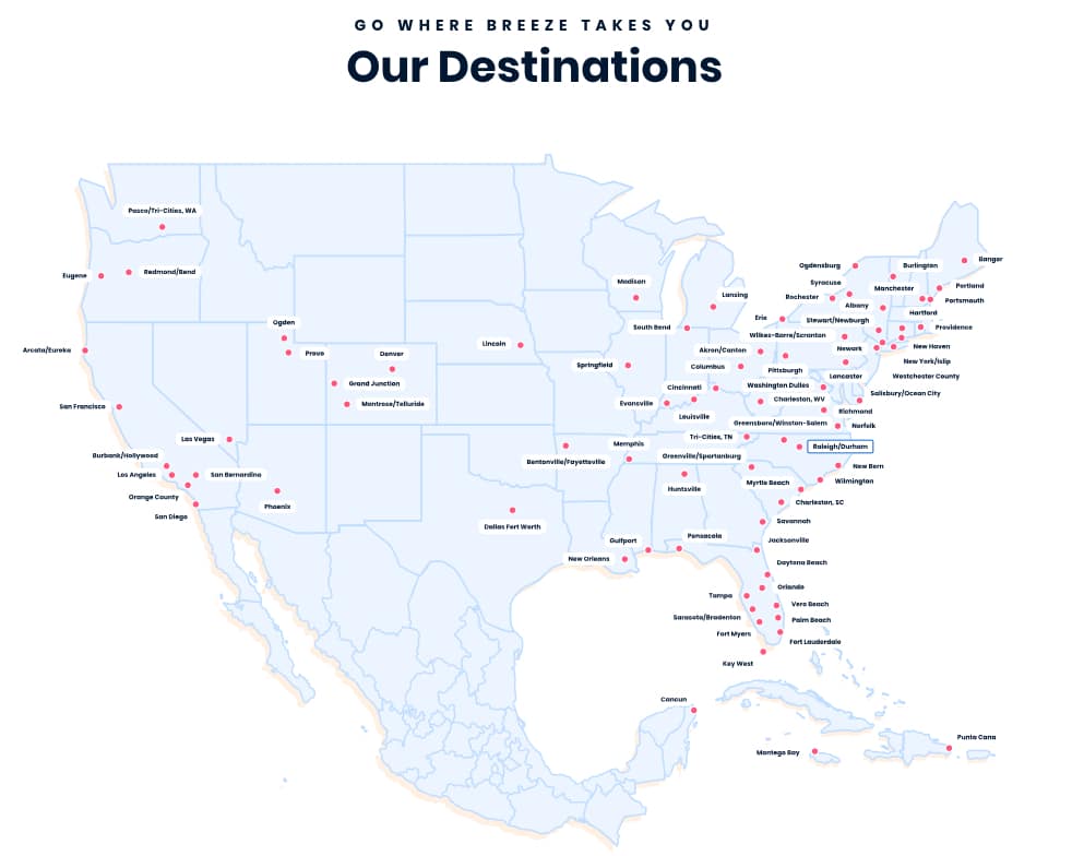 RDU has become a critical part of Breeze’s network and has seen exponential growth there in recent years. Currently, Breeze operates 40 daily flights to 32 nonstop destinations from RDU.