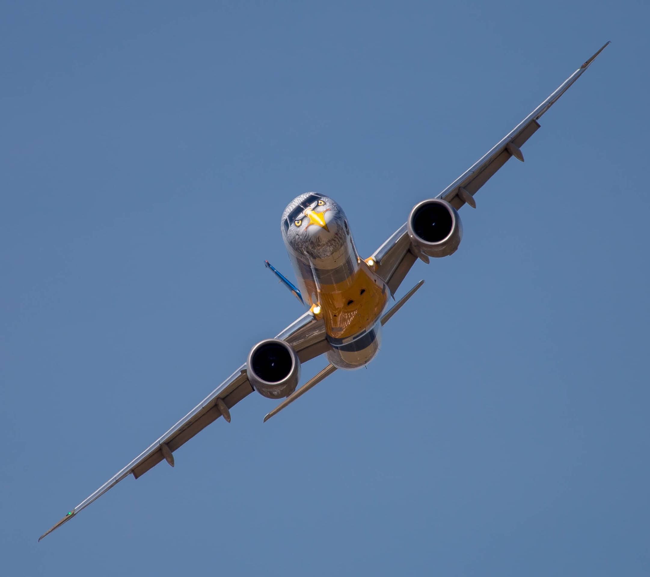 Embraer E195-E2 prototype, seen from front, showing its gull wing | IMAGE: Clemens Vasters CC BY 2.0, https://commons., ikimedia.org/w/index.php?curid=60298967