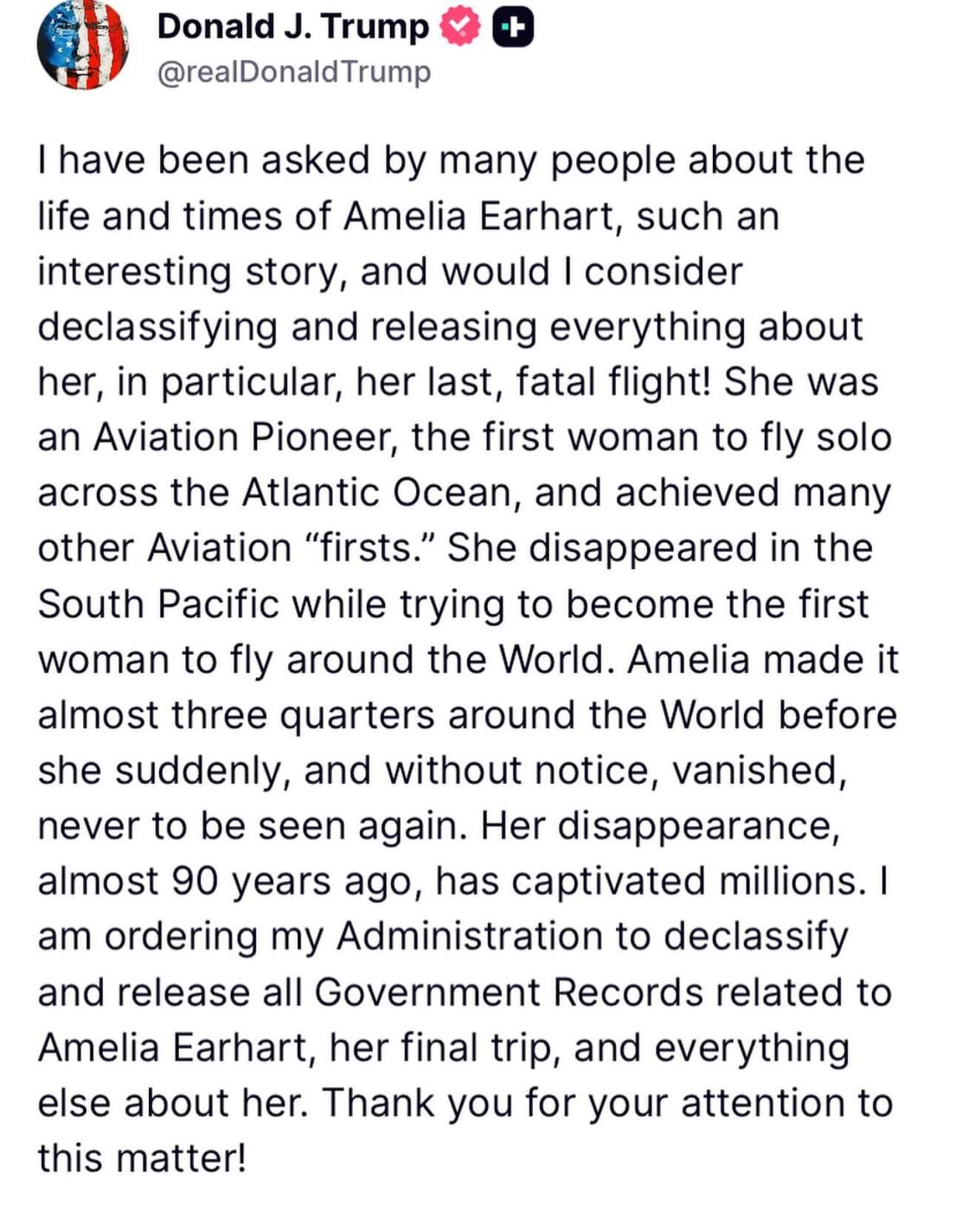“Amelia made it almost three quarters around the World before she suddenly, and without notice, vanished, never to be seen again,” said Trump in a social media post. “Her disappearance has captivated millions. I am ordering my Administration to declassify and release all Government Records related to Amelia Earhart, her final trip, and everything else about her.”