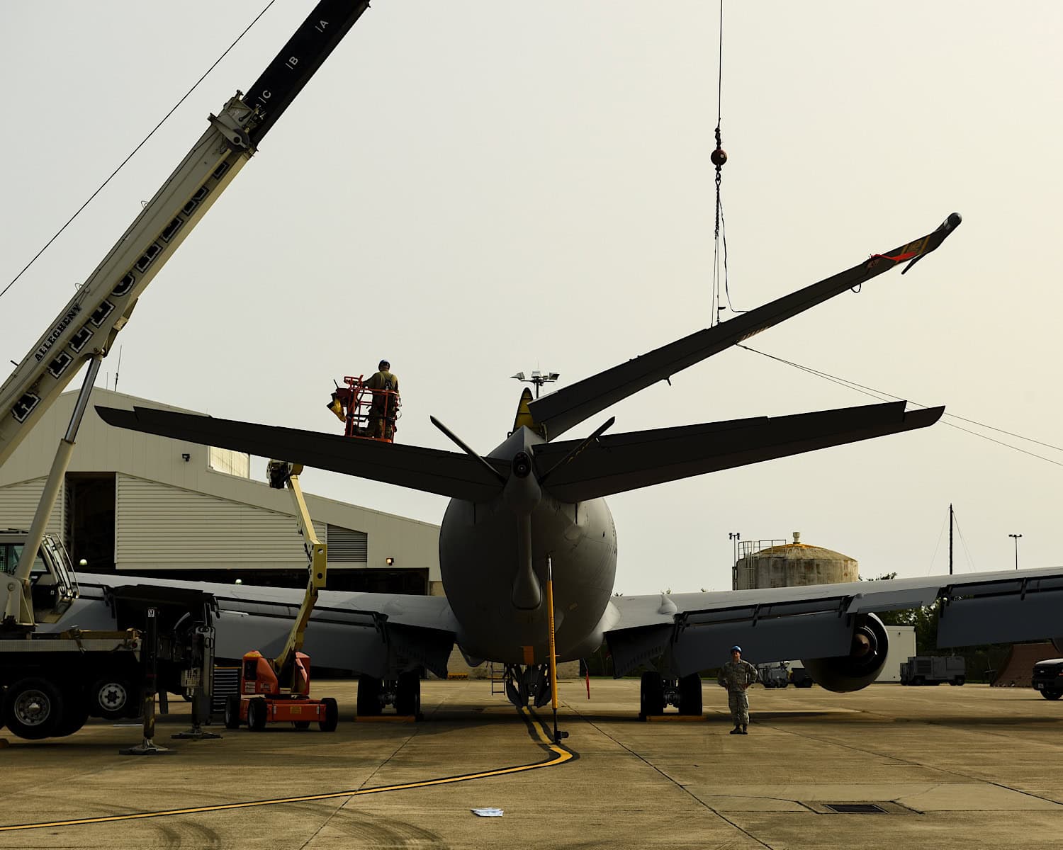 The complex operation requires a team with a high degree of proficiency and specialized equipment. Multiple shops are involved and must work together. The KC-135 has a support bar that allows the tail to be held at 90 degrees, lying horizontal while still attached to the plane.
